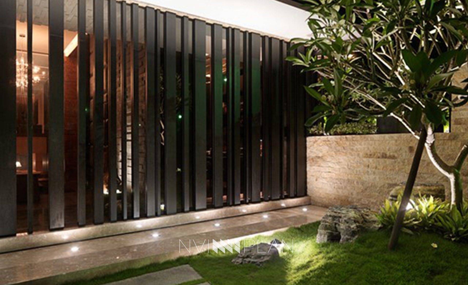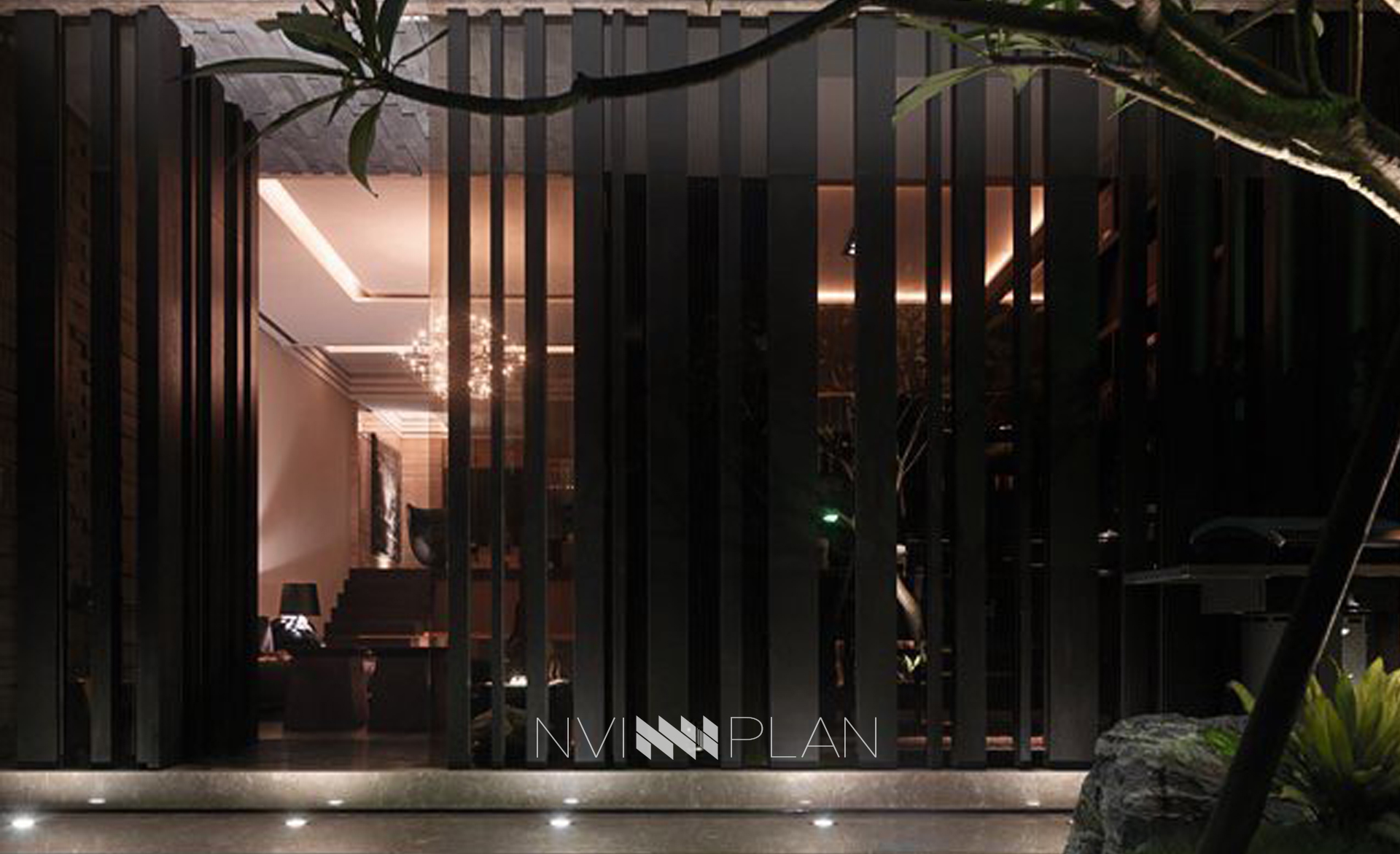 以垂直鐵件格柵結構 搭配簡練的景觀造景